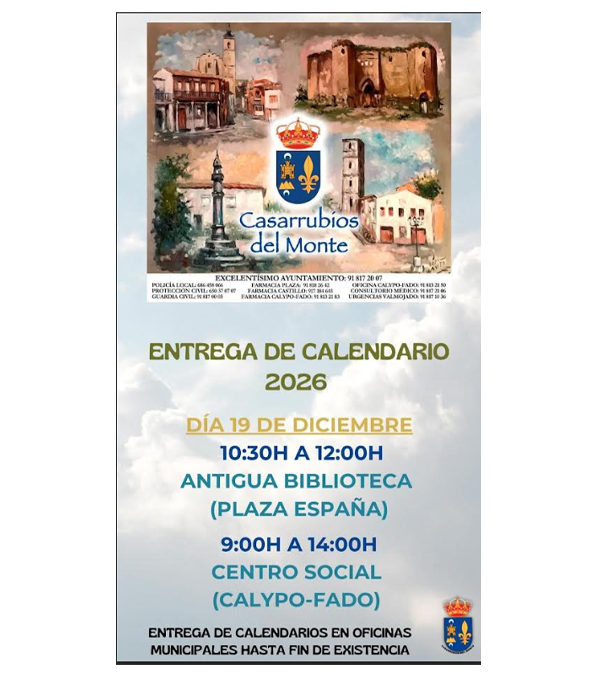 ENTREGA CALENDARIO 2026 Información ENTREGA DE CALENDARIOS EN LAS OFICINAS MUNICIPALES HASTA FIN DE EXISTENCIAS. DÍA: 19 de Diciembre 2025 LUGAR: Antigua Biblioteca (Plaza España) HORA: De 10:30 H a 12:00 H DÍA: 19 de Diciembre 2025 LUGAR: Centro Social (Calypo-Fado) HORA: De 09:00 H a 14:00 H DESCARGAR DOCUMENTO Ayuntamiento de Casarrubios… Seguir leyendo ENTREGA CALENDARIO 2026